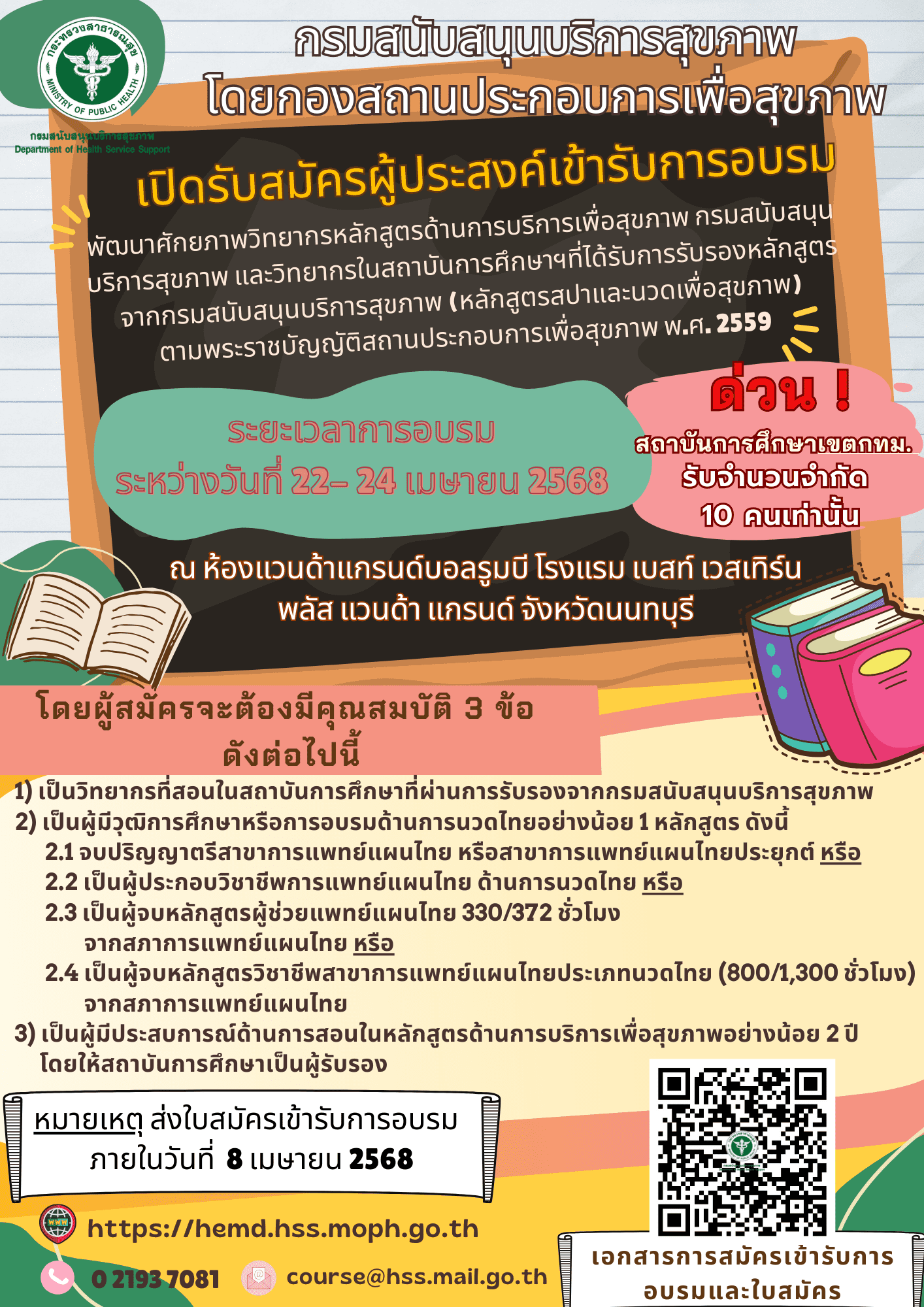ขอเชิญชวนสถานประกอบการเพื่อสุขภาพ กิจการสปา นวดเพื่อสุขภาพ และการดูแลผู้สูงอายุหรือมีภาวะพึ่งพิง เข้าร่วมเป็นแหล่งฝึกภาคสนาม เปิดรับสมัครผู้ประสงค์เข้ารับการอบรมพัฒนาศักยภาพวิทยากรหลักสูตรด้านการบริการเพื่อสุขภาพ