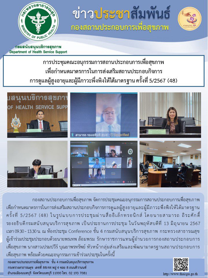 กองสถานประกอบการเพื่อสุขภาพ จัดการประชุมคณะอนุกรรมการสถานประกอบการเพื่อสุขภาพเพื่อกำหนดมาตรการในการส่งเสริมสถานประกอบกิจการการดูแลผู้สูงอายุและผู้มีภาวะพึ่งพิงให้ได้มาตรฐานครั้งที่ 5/2567 (48) ในรูปแบบการประชุมผ่านสื่ออิเล็กทรอนิกส์ โดยนายสามารถ ถิระศักดิ์รองอธิบดีกรมสนับสนุนบริการสุขภาพ เป็นประธานการประชุม ในวันพฤหัสบดีที่ 13 มิถุนายน 2567 เวลา 09.30 – 13.30 น. ณ ห้องประชุม Conference ชั้น 4 กรมสนับสนุนบริการสุขภาพ กระทรวงสาธารณสุข ผู้เข้าร่วมประชุมประกอบด้วยนายพรเทพ ล้อมพรม รักษาราชการแทนผู้อำนวยการกองสถานประกอบการเพื่อสุขภาพ นางสาวเปรมปวีร์ บุณยาพรทรัพย์ หัวหน้ากลุ่มส่งเสริมและพัฒนามาตรฐานสถานประกอบการเพื่อสุขภาพ พร้อมด้วยคณะอนุกรรมการเข้าร่วมประชุมในครั้งนี้