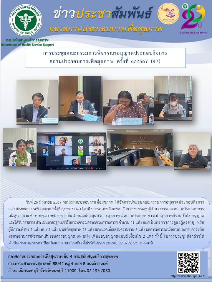 วันที่ 26 มิถุนายน 2567 กองสถานประกอบการเพื่อสุขภาพ ได้จัดการประชุมคณะกรรมการอนุญาตประกอบกิจการสถานประกอบการเพื่อสุขภาพ ครั้งที่ 6/2567 (47) โดยมี นายพรเทพ ล้อมพรม รักษาราชการแทนผู้อำนวยการกองสถานประกอบการเพื่อสุขภาพ ณ ห้องประชุม conference ชั้น 4 กรมสนับสนุนบริการสุขภาพ มีสถานประกอบการเพื่อสุขภาพยื่นขอรับใบอนุญาต และได้รับการตรวจประเมินมาตรฐานเข้ารับการพิจารณาจากคณะกรรมการฯ จำนวน 41 แห่ง แยกเป็นกิจการการดูแลผู้สูงอายุ หรือผู้มีภาวะพึ่งพิง 5 แห่ง สปา 5 แห่ง นวดเพื่อสุขภาพ 28 แห่ง และนวดเพื่อเสริมความงาม 3 แห่ง ผลการพิจารณามีสถานประกอบการเพื่อสุขภาพผ่านการพิจารณาเห็นชอบควรอนุญาต 39 แห่ง เห็นชอบอนุญาตแบบมีเงื่อนไข 2 แห่ง ทั้งนี้ ในการประชุมดังกล่าวได้ดำเนินการตามมาตรการป้องกันและควบคุมโรคติดเชื้อไวรัสโคโรนา.2019(COVID-19).อย่างเคร่งครัด