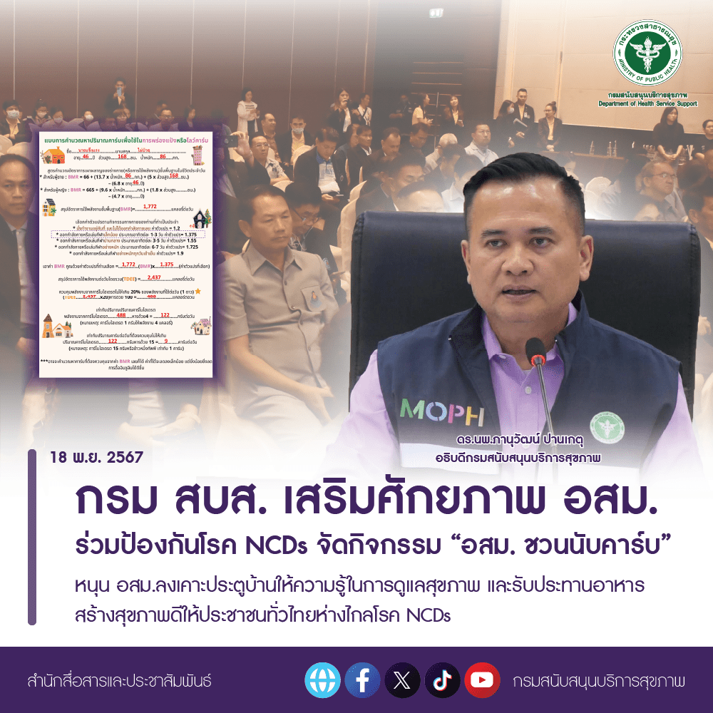 กรมสนับสนุนบริการสุขภาพ (กรม สบส.) เดินหน้าสร้างความเข้มแข็งของเครือข่ายภาคประชาชน ในการป้องกันโรคไม่ติดต่อเรื้อรัง หรือ NCDs จัดกิจกรรม “อสม. ชวนนับคาร์บ” หนุน อสม.ลงเคาะประตูบ้านให้ความรู้ชาวชุมชนในการรับประทานอาหารอย่างเหมาะสม สร้างพฤติกรรมสุขภาพดี ประชาชนทั่วไทยห่างไกลโรค NCDs ดร.นายแพทย์ภานุวัฒน์ ปานเกตุ อธิบดีกรม สบส. เผยว่า ตามนโยบายกระทรวงสาธารณสุข พ.ศ. 2568 “ยกระดับการสาธารณสุขไทย สุขภาพแข็งแรงทุกวัย เศรษฐกิจสุขภาพไทยมั่นคง” ซึ่งมุ่งส่งเสริมให้คนไทยห่างไกลโรค และภัยสุขภาพ โดยเฉพาะโรคไม่ติดต่อเรื้องรัง หรือ NCDs ด้วยการลดหรือไม่ใช้ยาเคมีในการรักษา แต่ให้นำแนวคิดเวชศาสตร์วิถีชีวิตและสุขภาพองค์รวม มาใช้ดูแล ส่งเสริมสุขภาพ ดังนั้น กรม สบส. ในฐานะหน่วยงานที่มีบทบาทสำคัญในการดูแลเครือข่ายสาธารณสุขภาคประชาชนอย่าง อสม. จึงได้เร่งผลักดันแนวทางการเสริมสร้างความเข้มแข็งของเครือข่าย อสม. ตามแนวคิด “NCDs ดีได้ ด้วยกลไก อสม.” เดินหน้าสนับสนุนองค์ความรู้ในการดูแล และปรับพฤติกรรมสุขภาพให้กับ อสม. ได้นำไปใช้ปฏิบัติและส่งต่อสู่ชุมชน โดยเฉพาะ การวางแผนรับประทานคาร์โบไฮเดรตหรือเรียกสั้นๆ ว่าคาร์บ ในชื่อกิจกรรม “อสม. ชวนนับคาร์บ” ซึ่งตั้งเป้าภายในสิ้นปี 2567 อสม. ทั่วประเทศ สามารถเข้าใจความหมาย และสูตรคำนวณปริมาณการรับประทานคาร์บ รวมทั้ง เป็นแกนนำสุขภาพลงเคาะประตูบ้านให้ความรู้ชาวชุมชนในการคำนวณปริมาณคาร์บที่ควรได้รับในแต่ละวัน โดยใช้แอปพลิเคชัน SMART อสม. พร้อมบันทึกข้อมูลสุขภาพของประชาชนลงในแอปพลิเคชัน SMART อสม. ซึ่งเชื่อมโยงกับระบบ “3 หมอรู้จักคุณ” เพื่อเป็นฐานข้อมูลในการดูแลสุขภาพประชาชน โดยจะมีการขอความร่วมมือจากประธานชมรม อสม. ในทุกระดับทั้ง ภาค เขต หรือจังหวัด ฯลฯ ร่วมติดตามความก้าวหน้าในการดำเนินกิจกรรม “อสม. ชวนนับคาร์บ” ให้เกิดผลสัมฤทธิ์ตามที่กระทรวงสาธารณสุขตั้งเป้าหมายไว้ในการป้องกัน และลดความเสี่ยงการเกิดโรค NCDs ของประชาชนชาวไทย นายแพทย์กรกฤช ลิ้มสมมุติ รองอธิบดีกรม สบส. กล่าวเพิ่มเติมว่า นอกจาก กิจกรรม “อสม. ชวนนับคาร์บ” แล้ว เพื่อให้การลดโรค NCDs ดำเนินการโดยรวดเร็ว กรม สบส. ยังกำหนดแนวทางเสริมความเข้มแข็งให้ อสม. ได้ร่วมมีบทบาทในการลดโรค NCDs ใน 5 ด้าน ได้แก่ 1. อสม. คัดกรองสุขภาพประชาชน อายุ 35 ปีขึ้นไป โดยใช้แอปพลิเคชัน SMART อสม. 2. อสม.ให้คำแนะนำในการปรับเปลี่ยนพฤติกรรมสุขภาพ ได้แก่ การนับคาร์บ/การควบคุมอาหารหวาน มัน เค็ม/ การออกกำลังกาย 3. สร้างอาสาสมัครประจำครอบครัว (อสค.) ดูแลการกินยา สุขภาพใจ จัดสภา